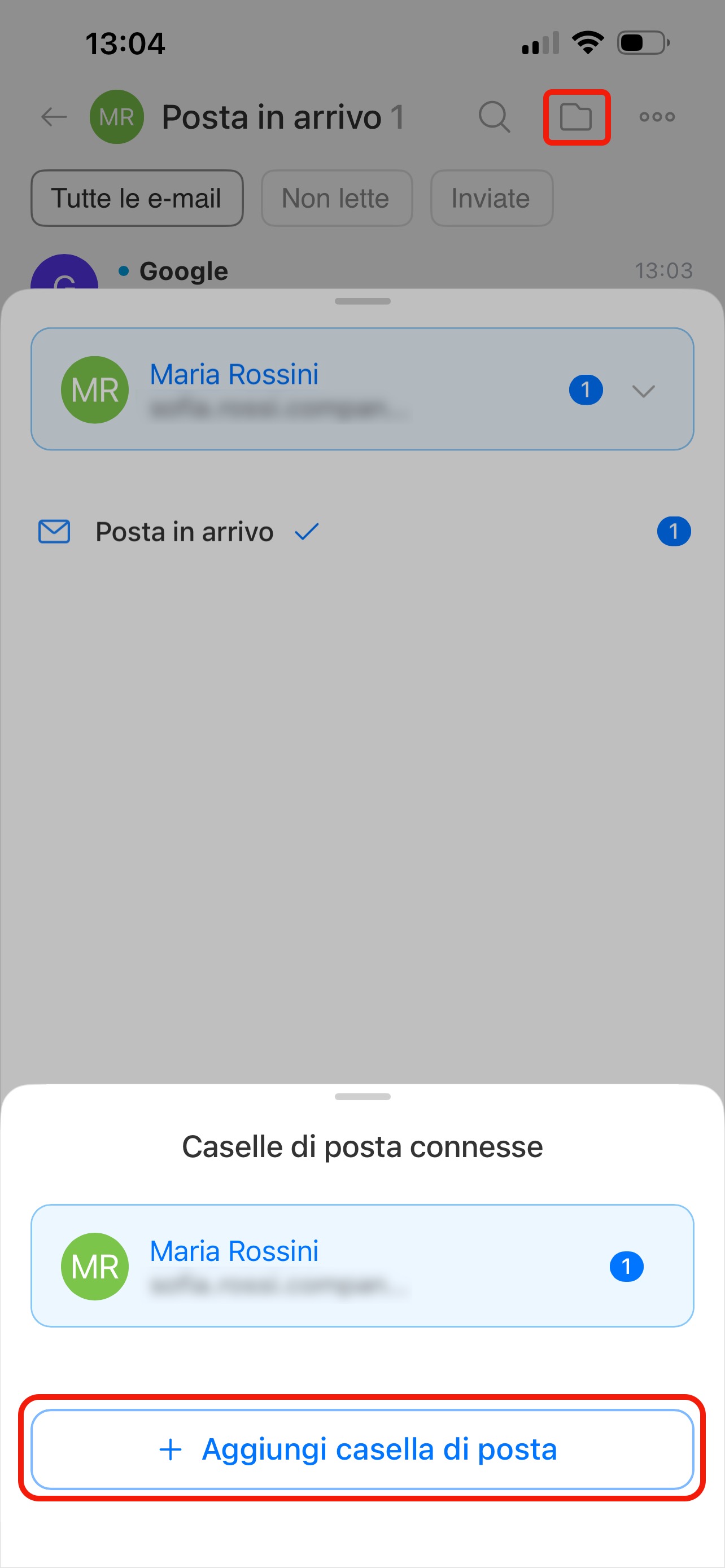 Ad esempio, una casella di lavoro per comunicare con i clienti e una personale per attività interne: tutte le e-mail saranno in un unico posto. Tocca l’icona della cartella