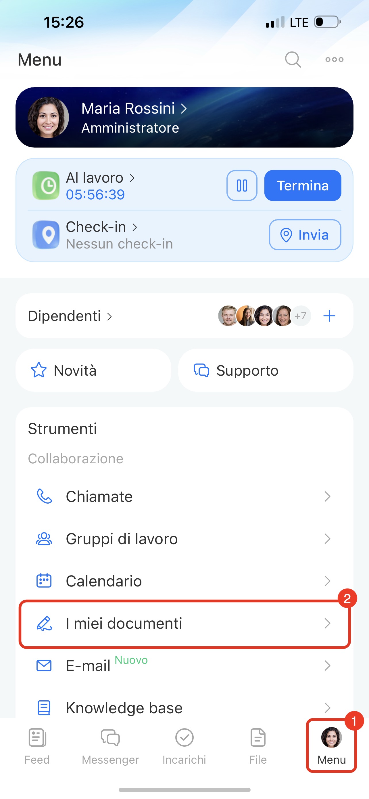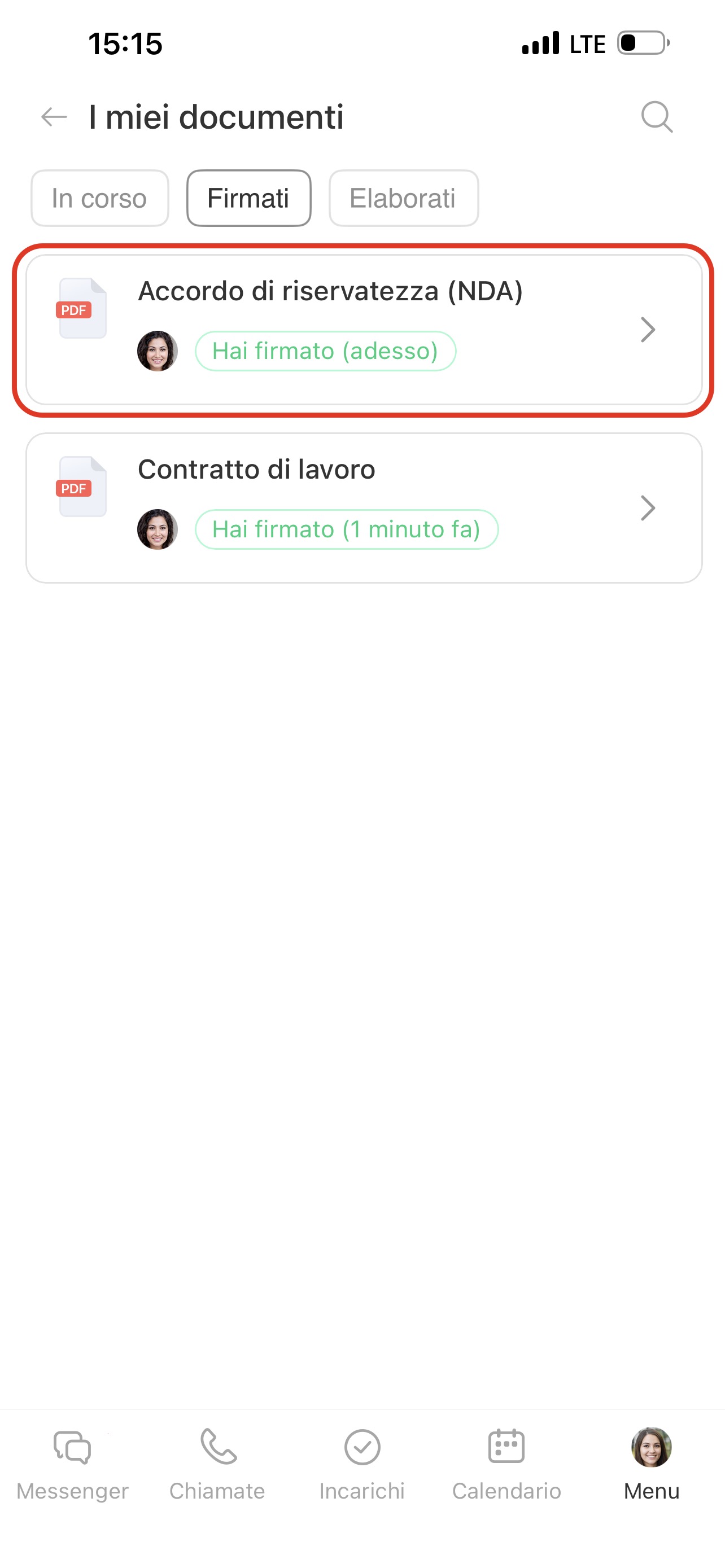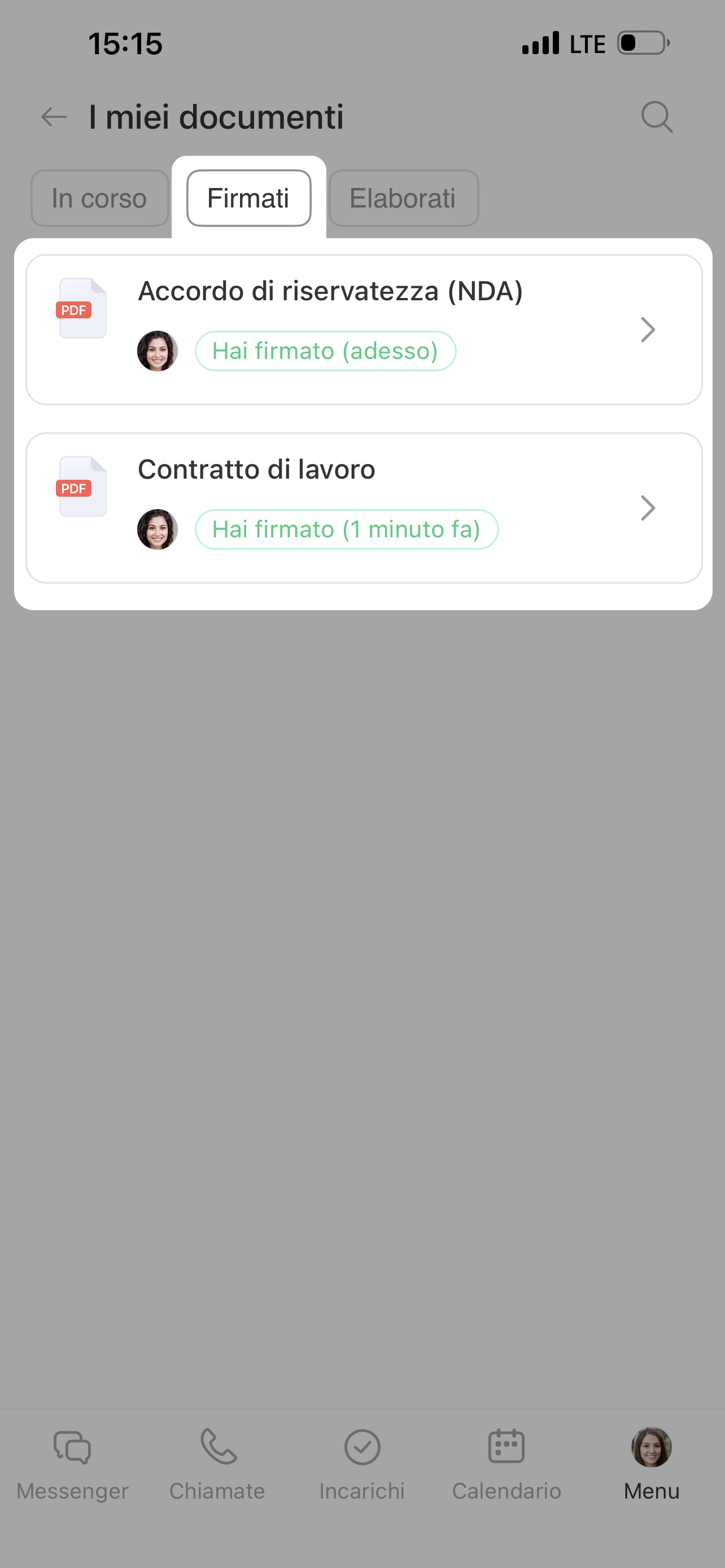 Nell’app mobile Bitrix24 è disponibile la sezione I miei documenti. In questa sezione è possibile firmare documenti e monitorarne lo stato.