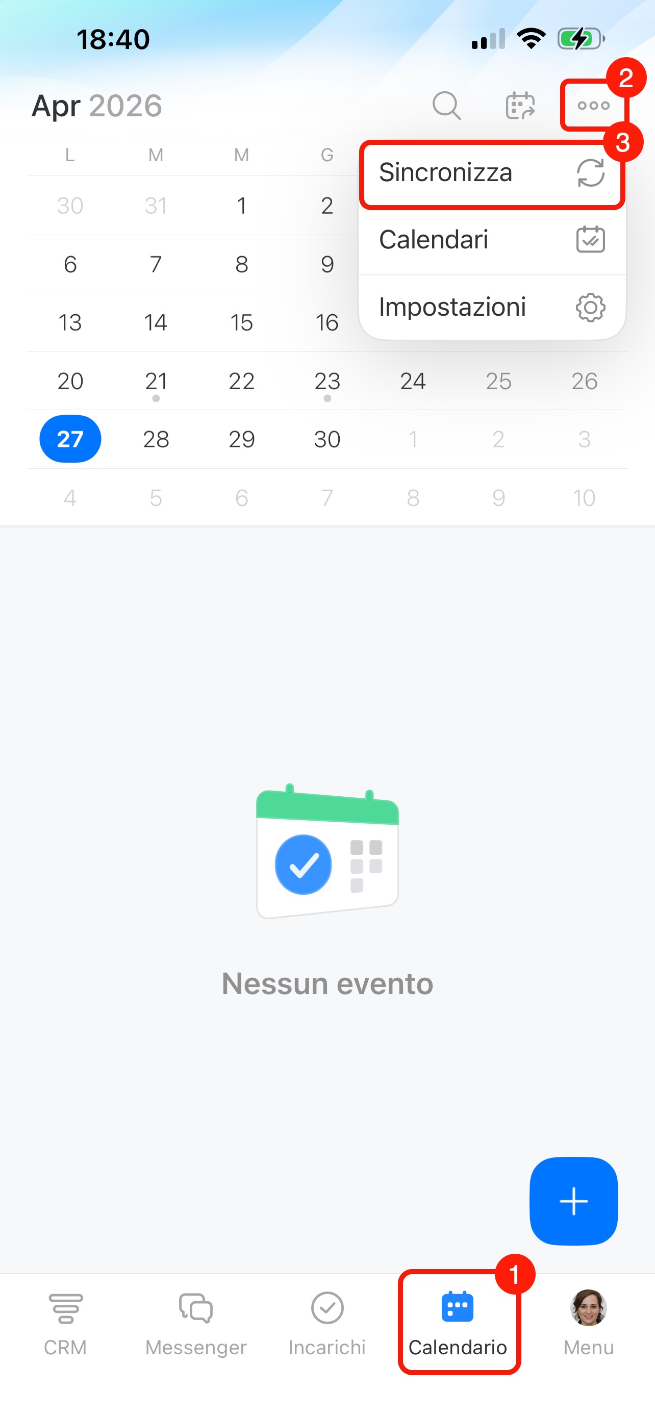 Vai alla sezione Calendario: puoi trovarla nella barra inferiore dell'app mobile o nella sezione Menu. Tocca Tre punti (...) nell'angolo in alto a destra e seleziona Sincronizza.