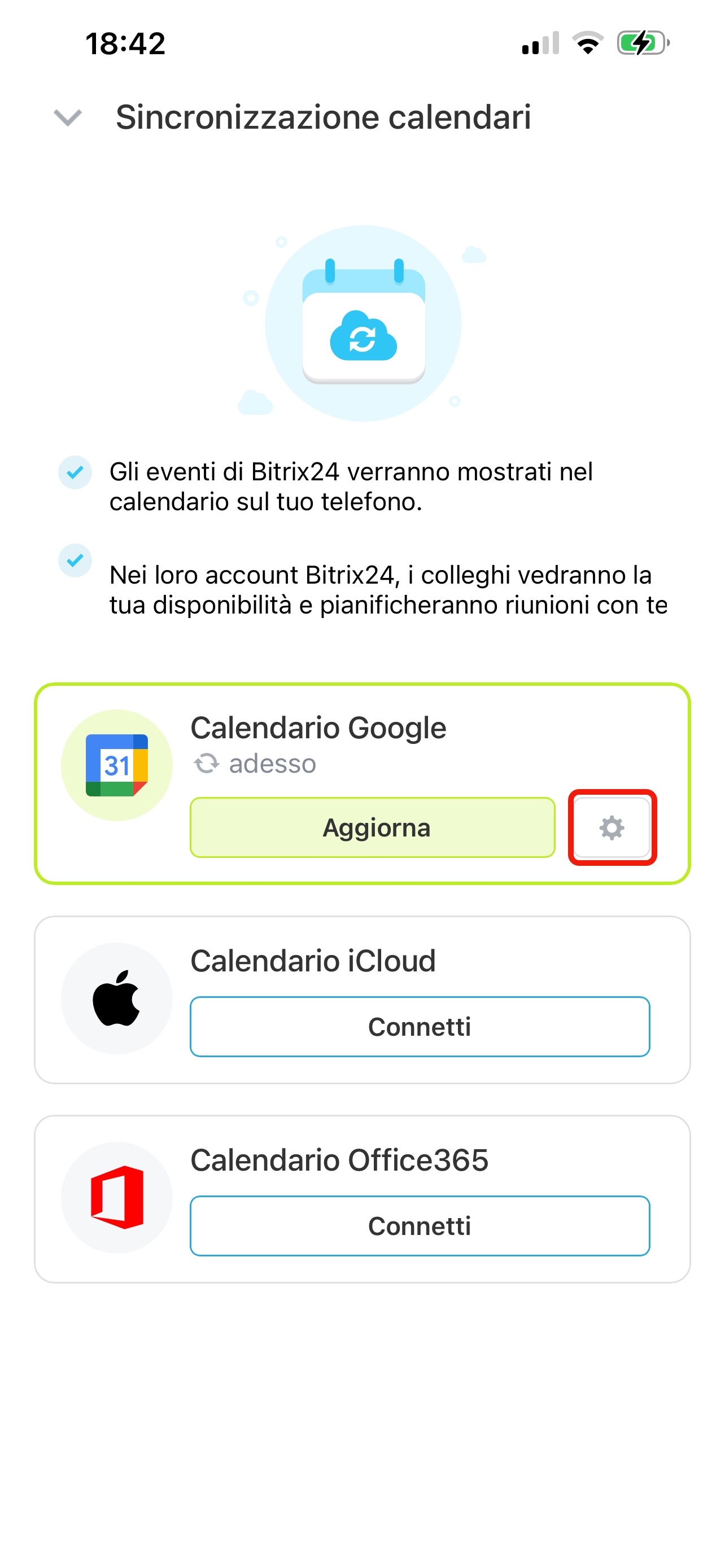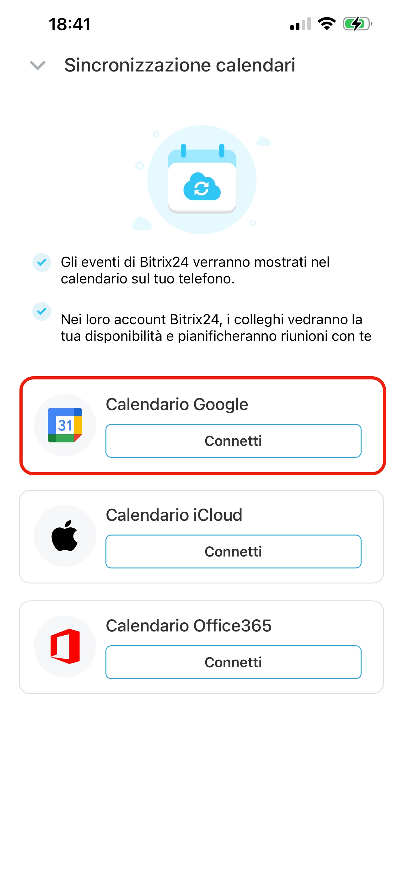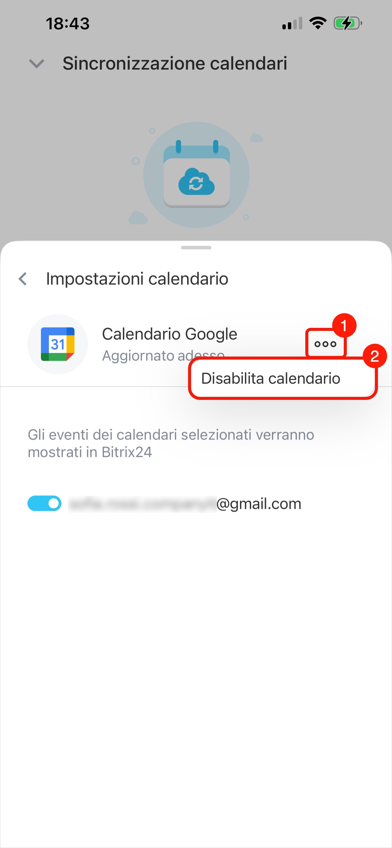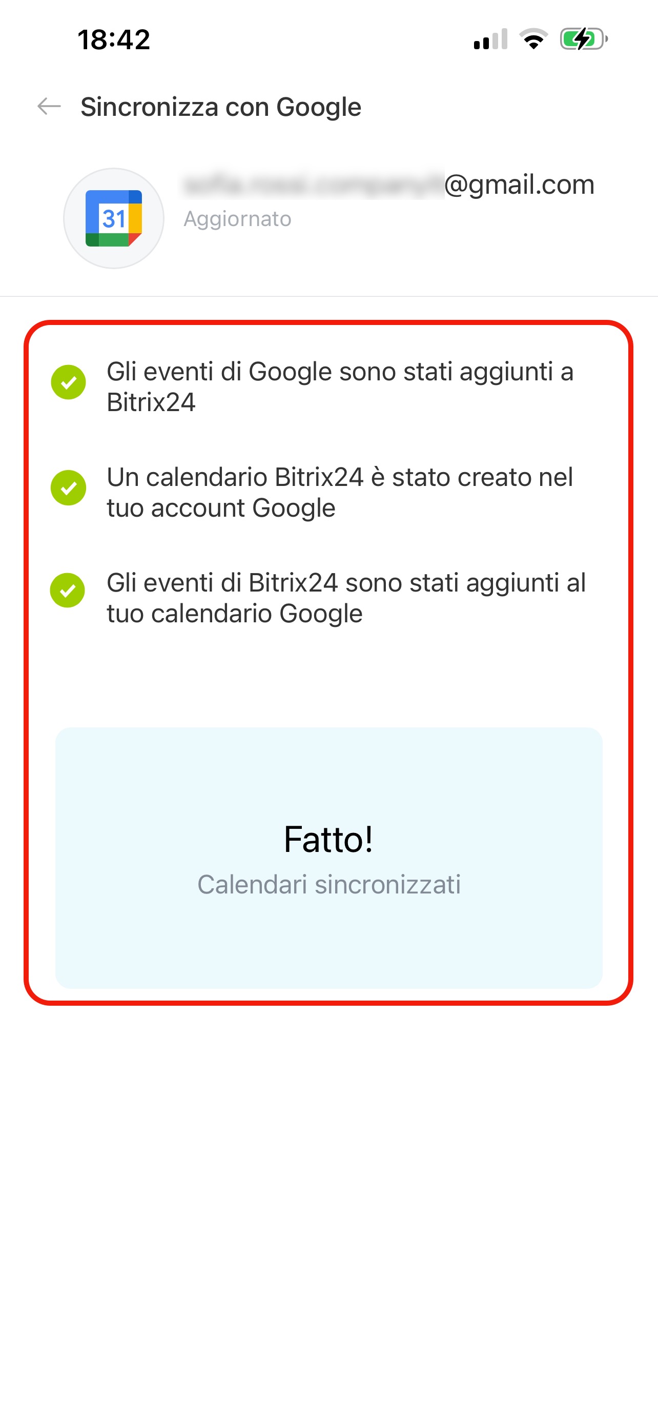 Gli eventi di Google non verranno più visualizzati in Bitrix24. Nell'account Google resterà il calendario Bitrix24 creato durante la sincronizzazione. Puoi eliminarlo manualmente: questo non influirà sui dati in Bitrix24.