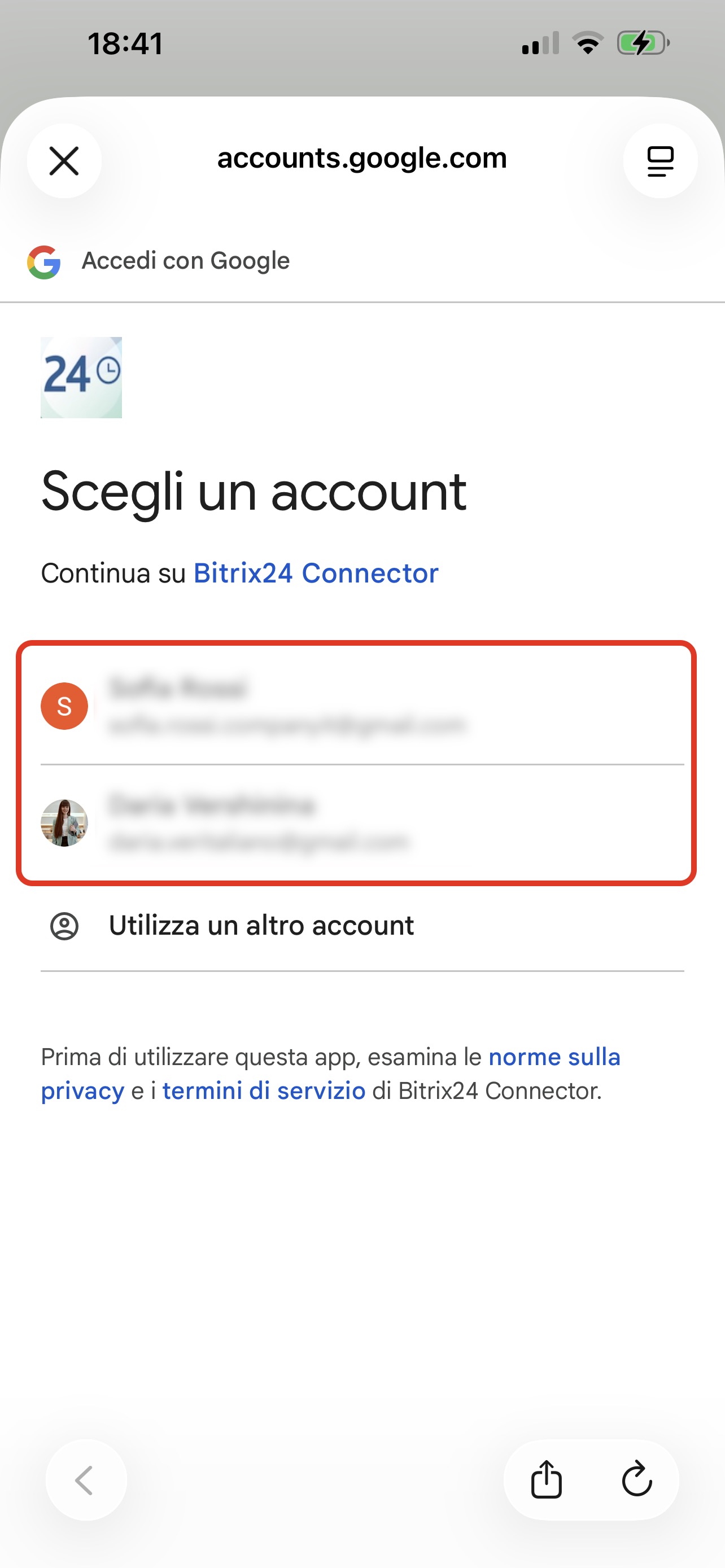 Accedi al tuo account Google oppure seleziona uno degli account aggiunti al dispositivo. Tocca il pulsante Avanti. Segui le istruzioni sullo schermo: accedi all'app Bitrix24 Connector e concedi le autorizzazioni di accesso all'account Google.
