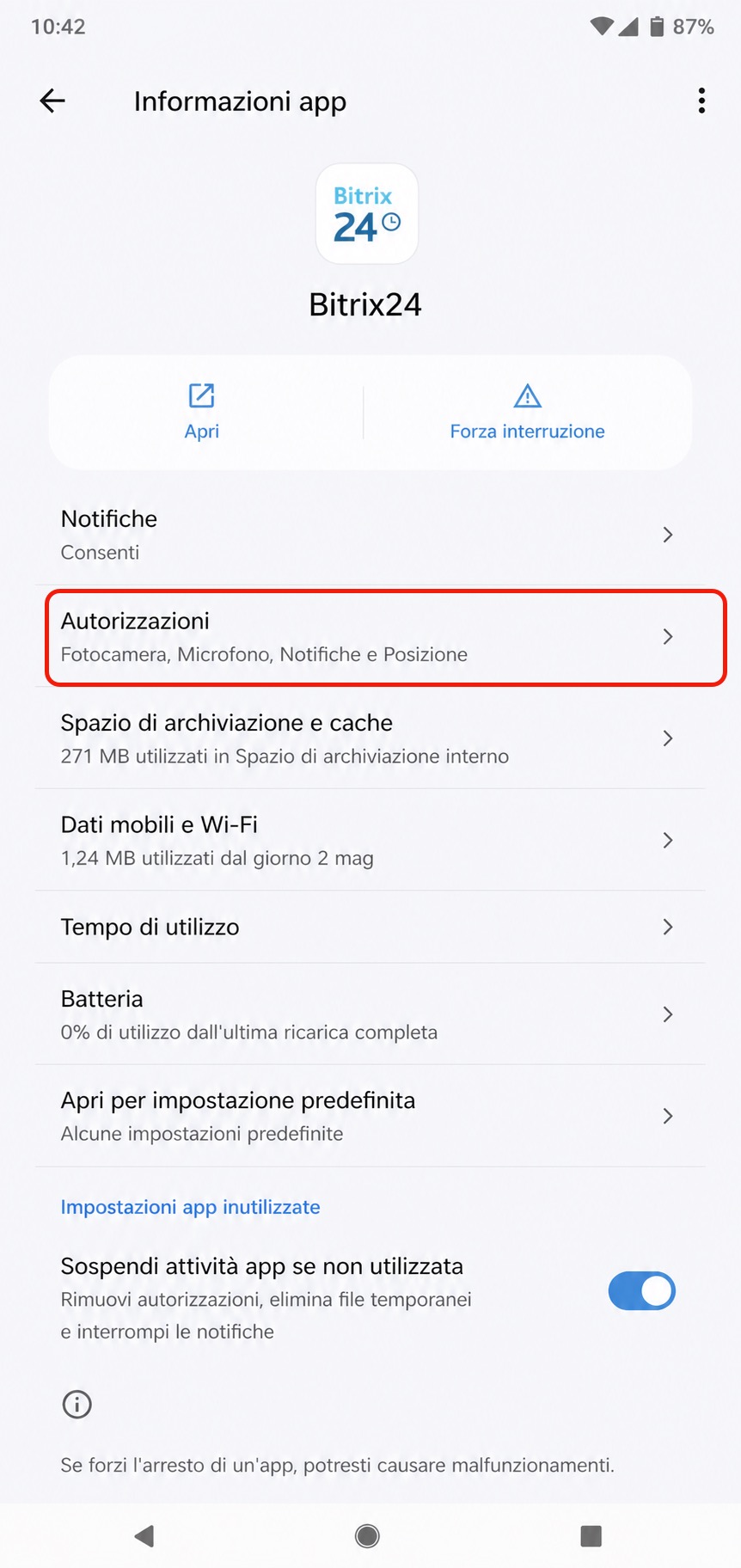 Controlla queste autorizzazioni per l’app Bitrix24. I nomi delle voci di menu e delle autorizzazioni dipendono dal modello del telefono e dalla versione di Android. Se non trovi il nome esatto, orientati in base al significato dell’impostazione.