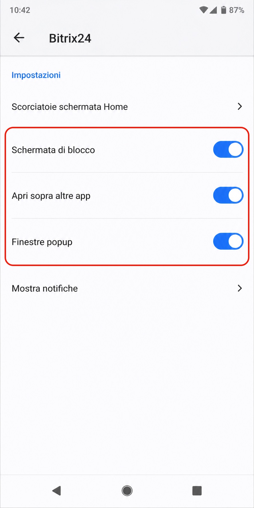 Schermata di blocco. L’app mobile Bitrix24 deve poter mostrare notifiche sulla schermata bloccata. Senza questa autorizzazione, la chiamata non apparirà quando il telefono è bloccato. L’opzione può chiamarsi Nella schermata di blocco, Mostra contenuti nella schermata di blocco o in modo simile.