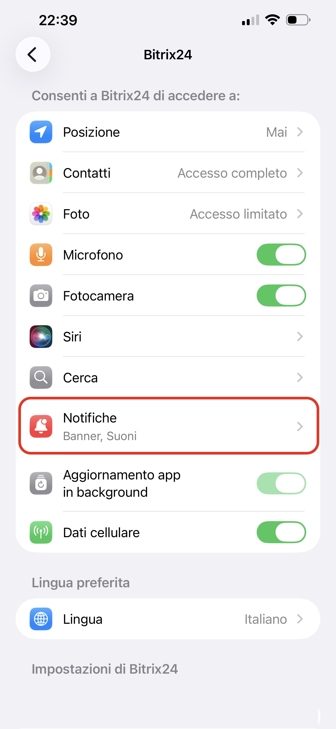 Su iPhone non è disponibile lo stesso set di autorizzazioni aggiuntive come su Android. Controlla le impostazioni delle notifiche per l’app Bitrix24.