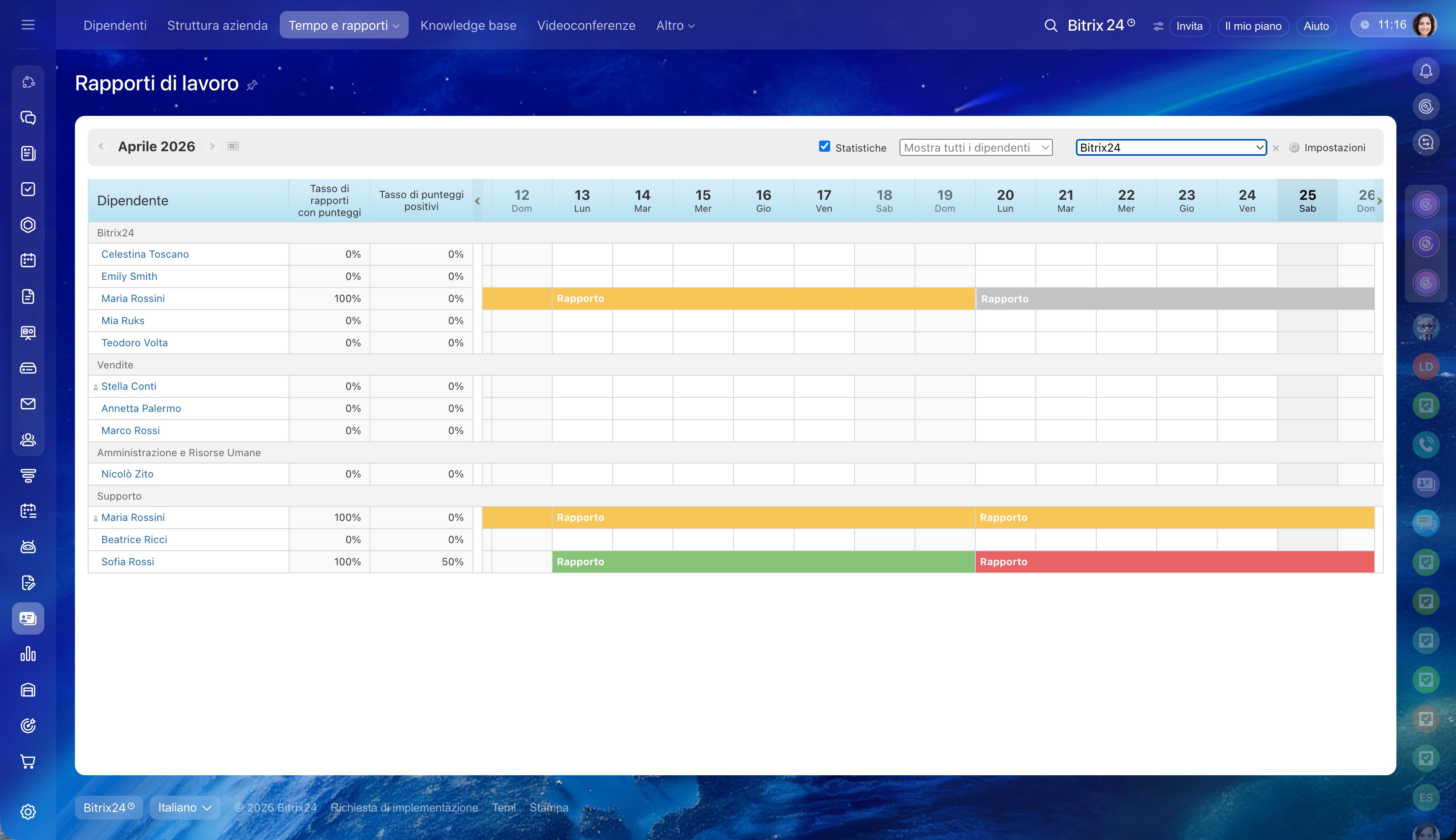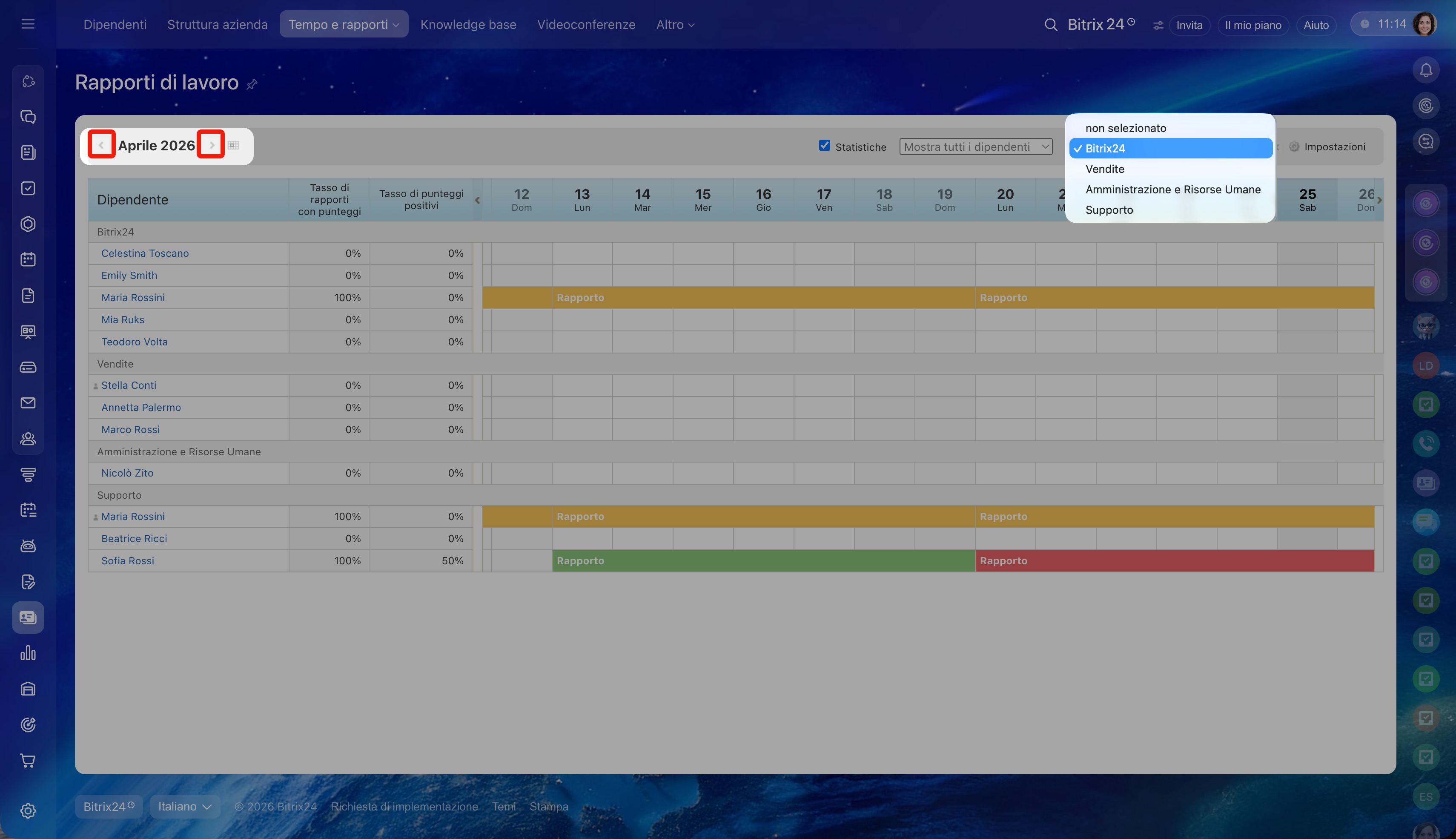 I rapporti di lavoro possono essere filtrati per reparto. Possono farlo un amministratore di Bitrix24 e un dipendente con le autorizzazioni di accesso appropriate: Amministrazione, Risorse umane o Accesso completo.
