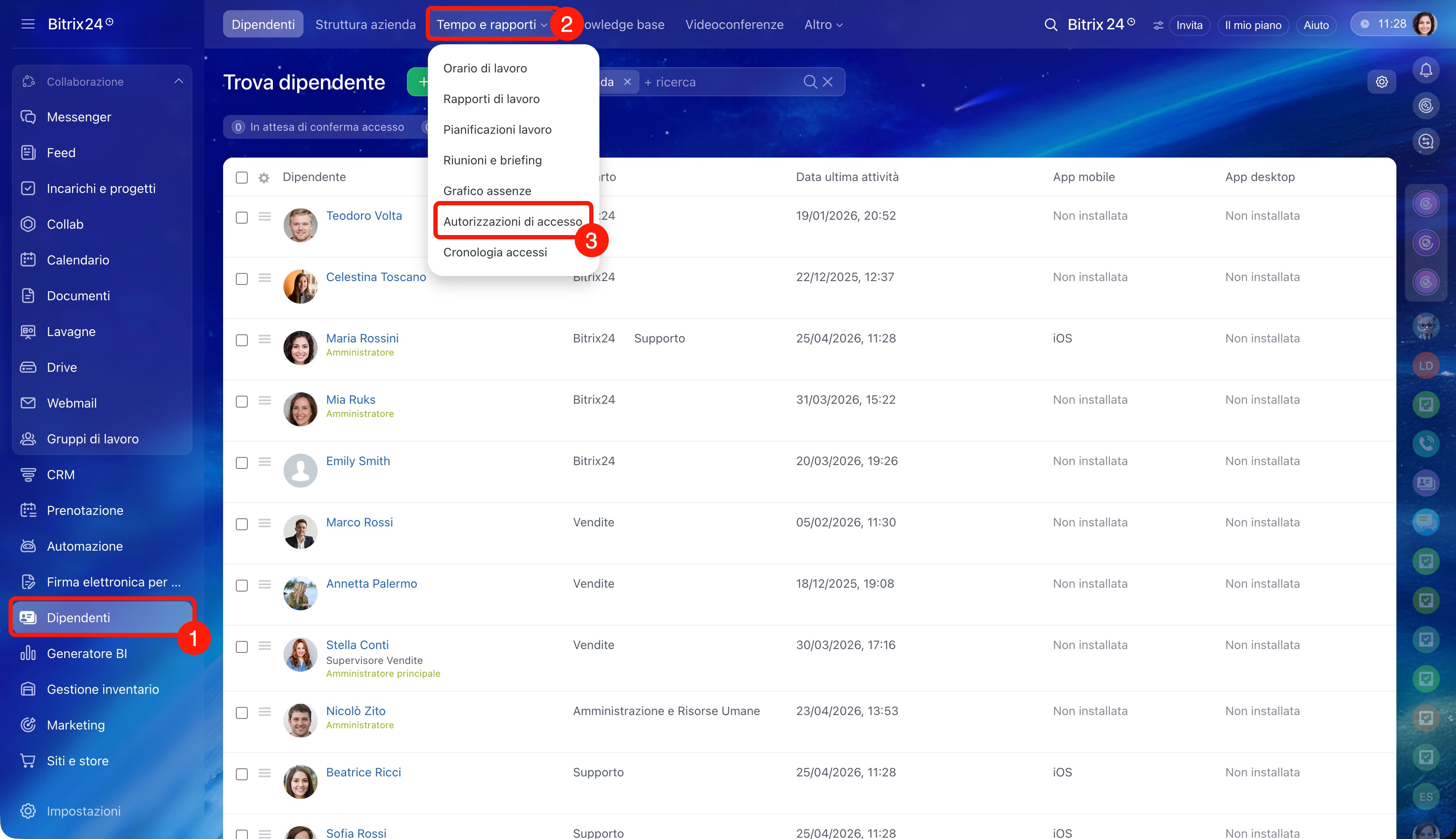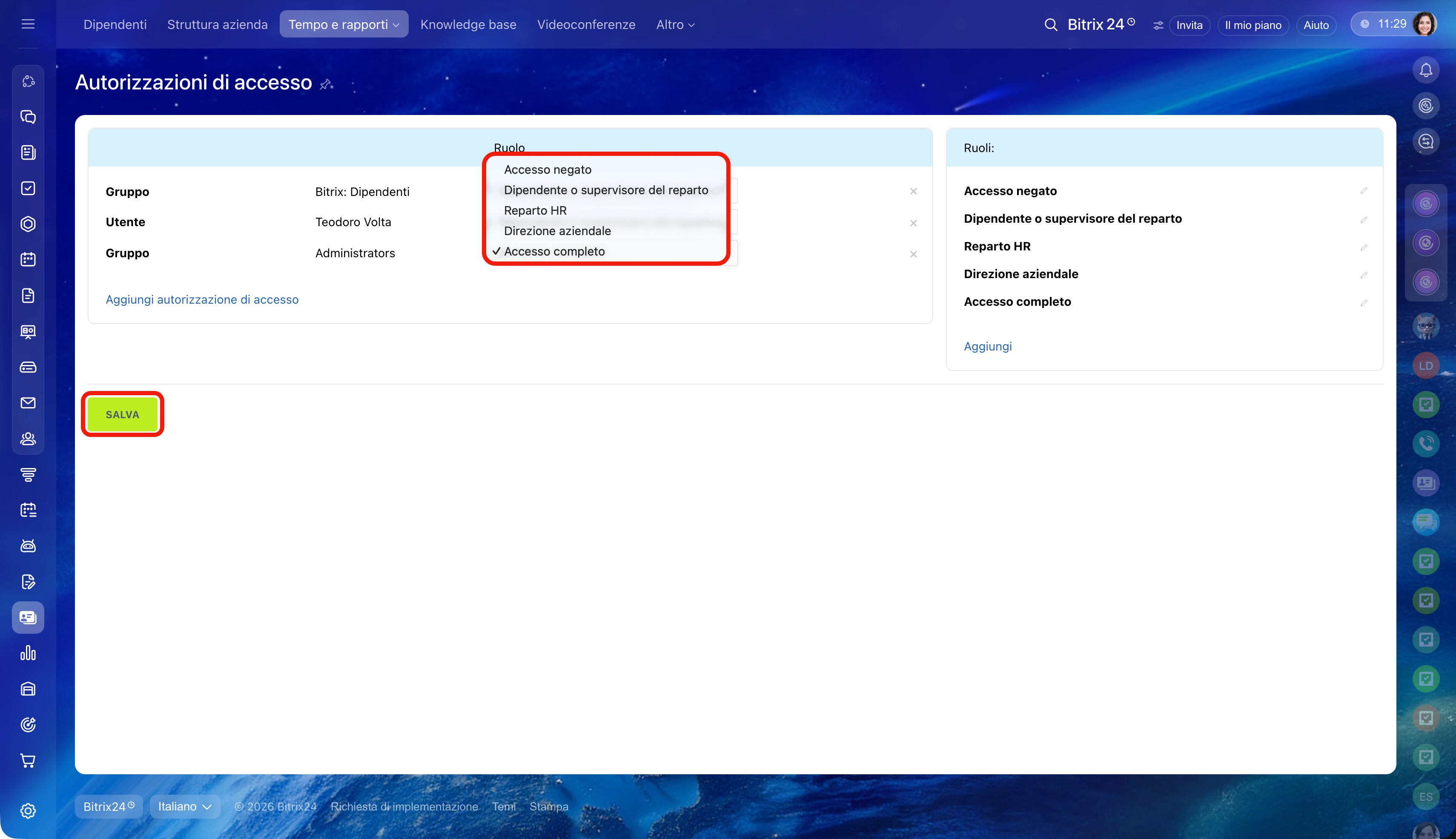 Vai alla sezione Dipendenti > Tempo e Rapporti > Autorizzazioni di accesso. Per impostazione predefinita sono già configurate le autorizzazioni standard ed è stato creato un elenco di ruoli. Puoi modificare queste autorizzazioni o assegnare nuovi ruoli a utenti specifici o a interi gruppi.