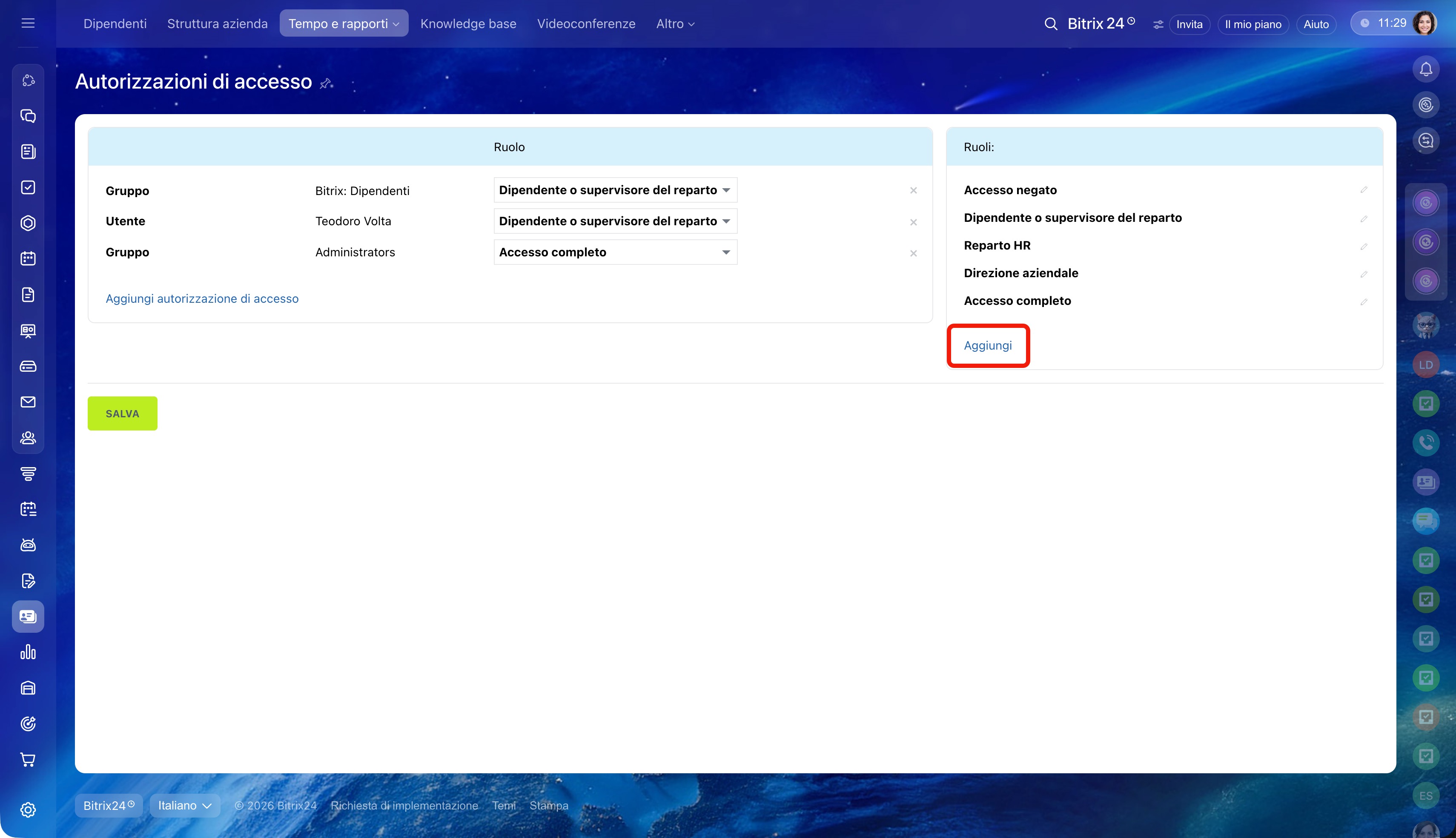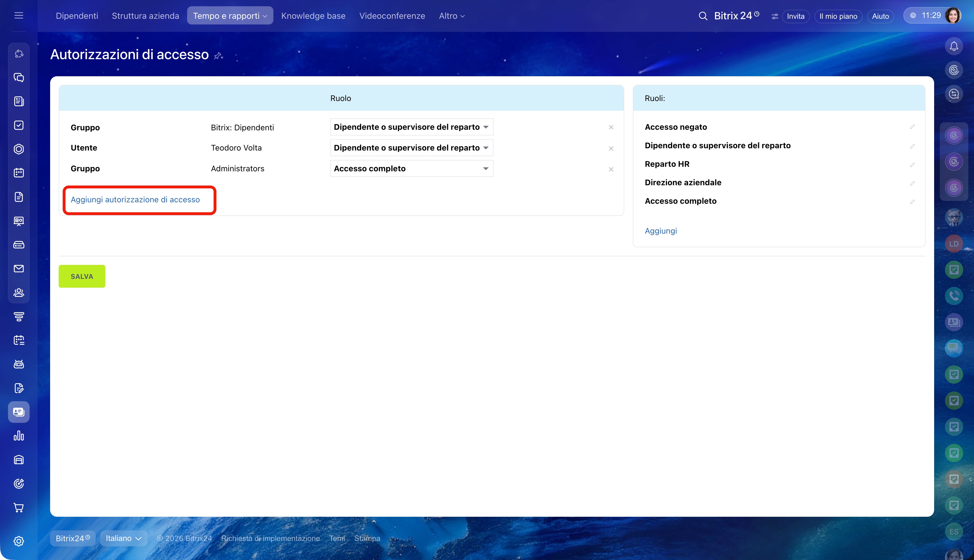 Nel pannello a sinistra trovi le autorizzazioni già configurate per gli Amministratori e per gli utenti standard di Bitrix24. Per configurare le autorizzazioni per un reparto specifico o per un dipendente, fai clic su Aggiungi autorizzazione di accesso.