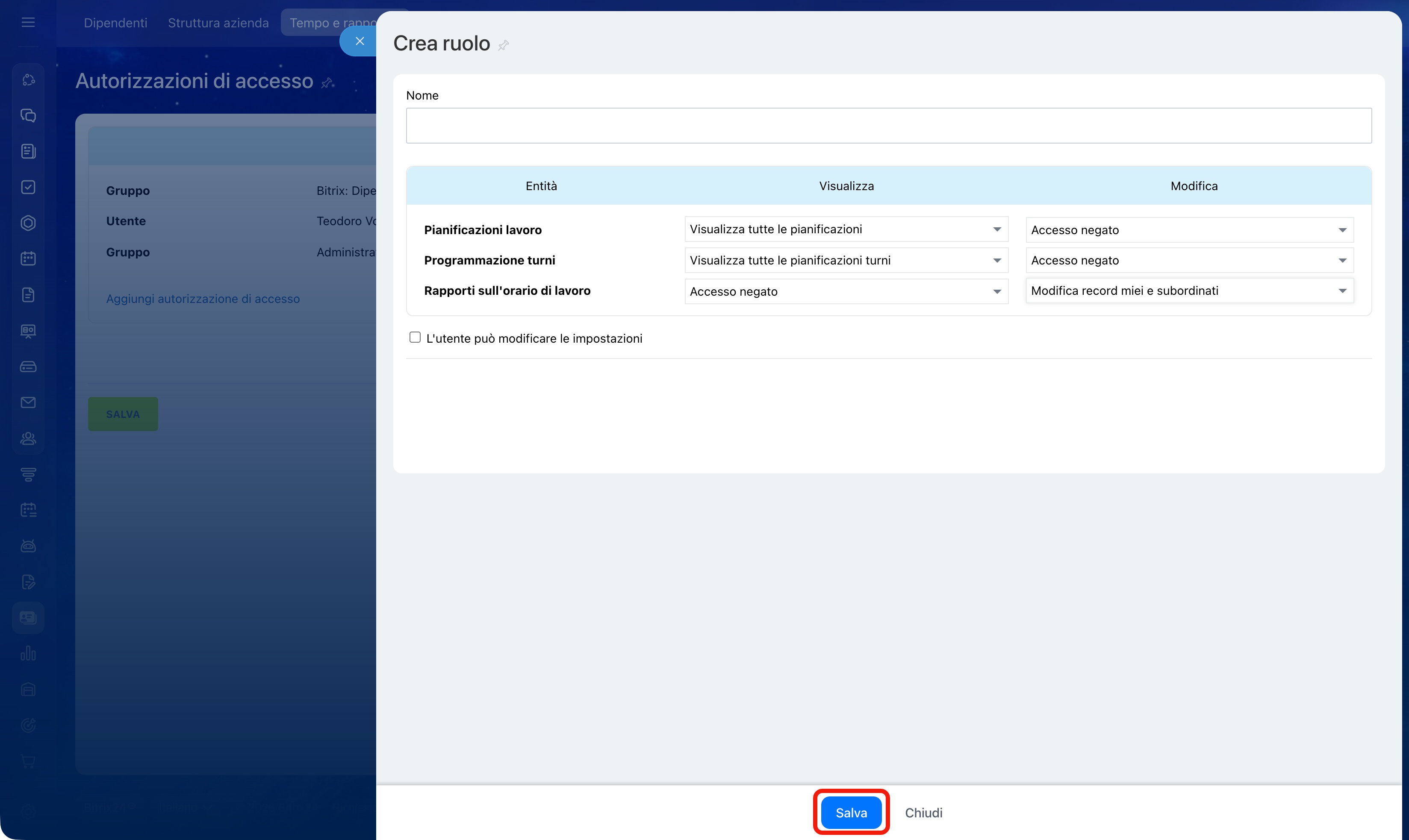 Inserisci il nome del ruolo e configura le autorizzazioni di lettura o modifica per le pianificazioni e le registrazioni dell'orario di lavoro. Fai clic su Salva.