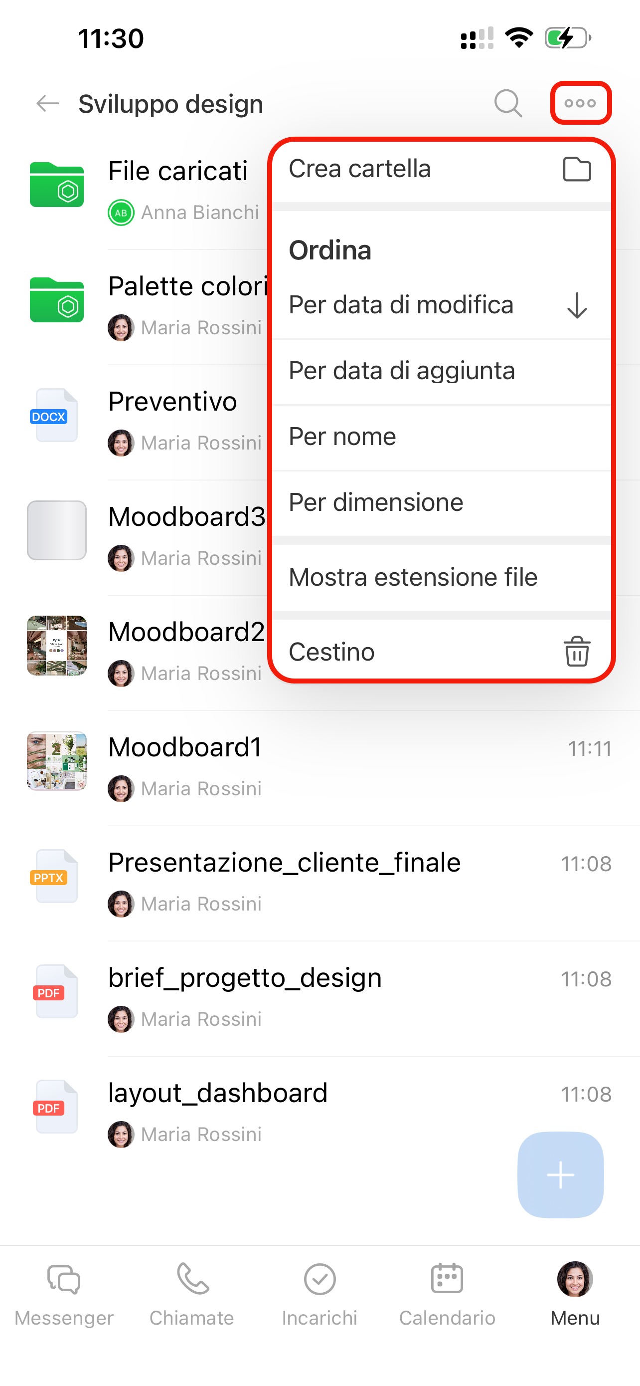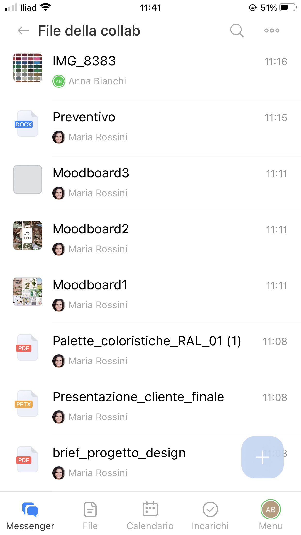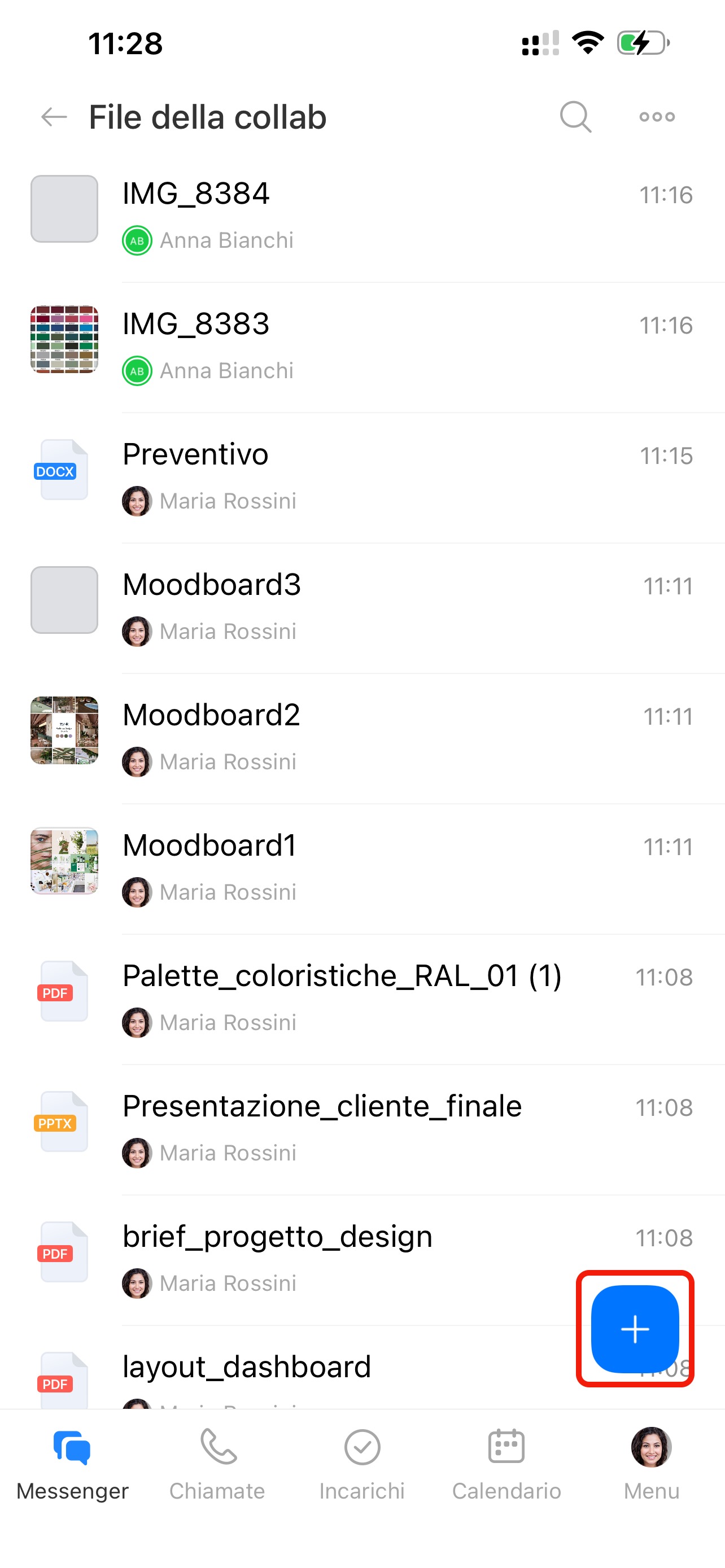 Nella sezione File della collab troverai tutti i documenti aggiunti, inclusi gli allegati a incarichi, riunioni e chat. Ogni file mostra il proprietario e la data in cui è stato caricato o modificato.