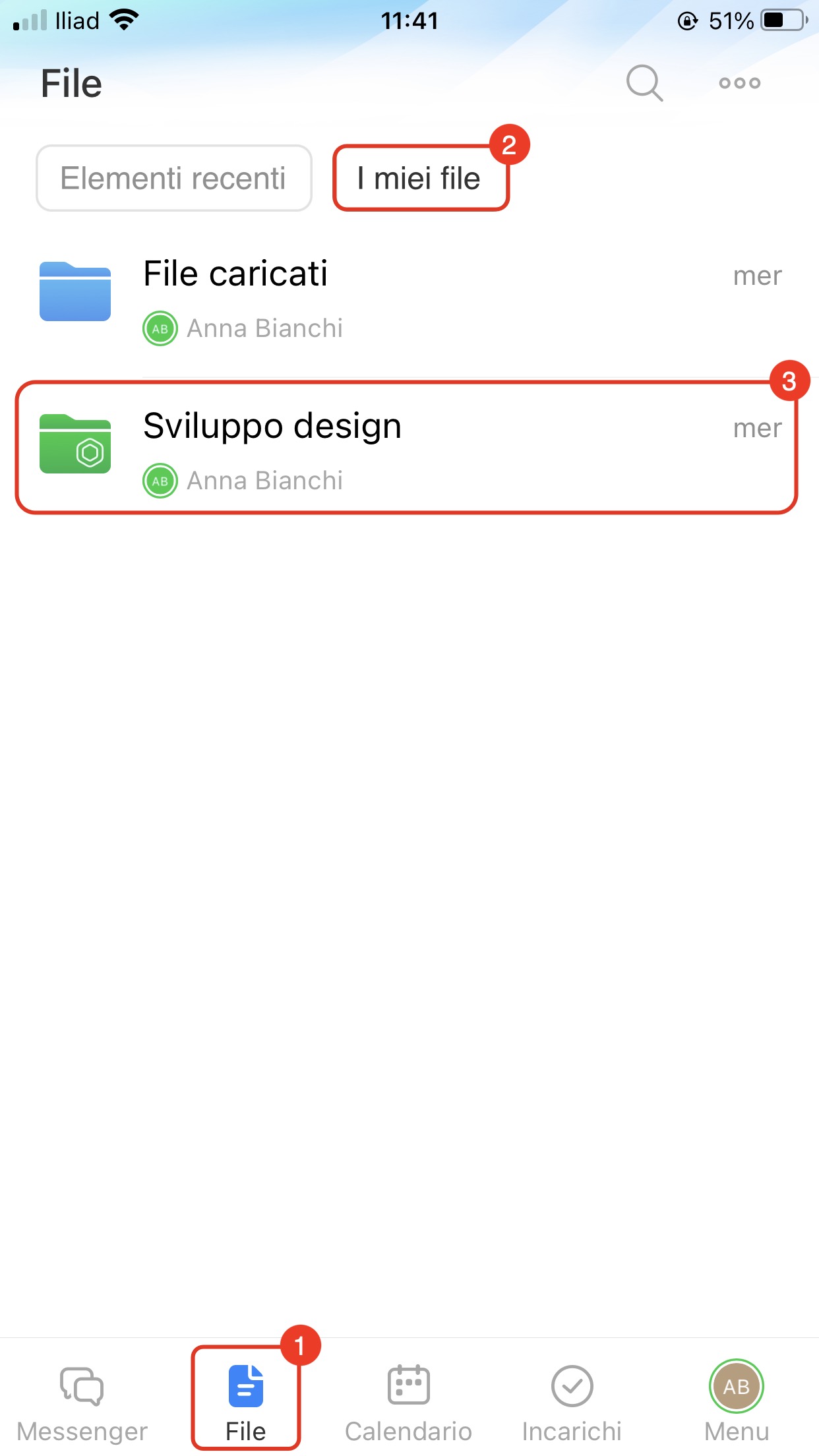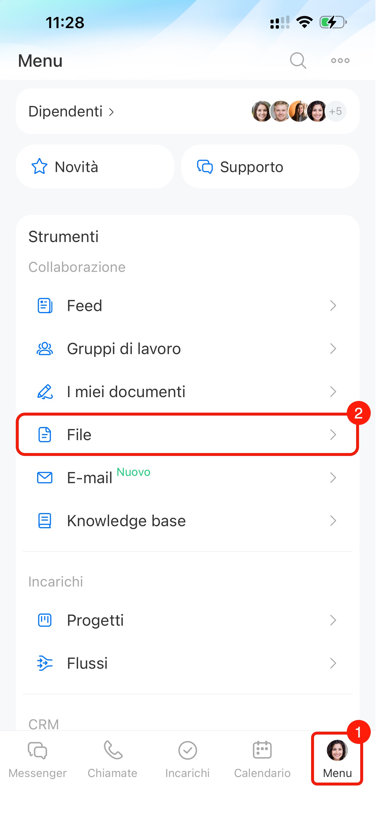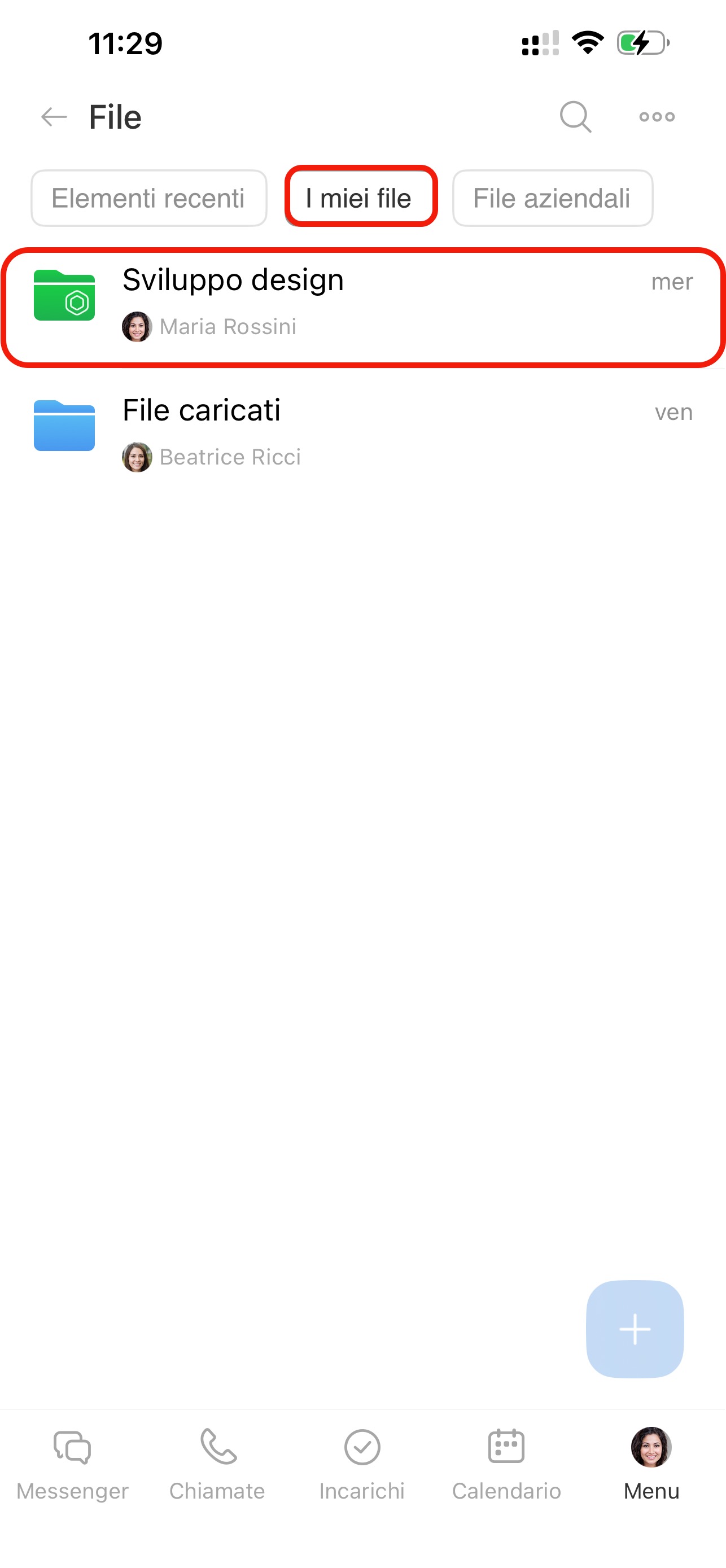 Nei file. Vai nel Menu > File per visualizzare i tuoi documenti aziendali, personali e condivisi.