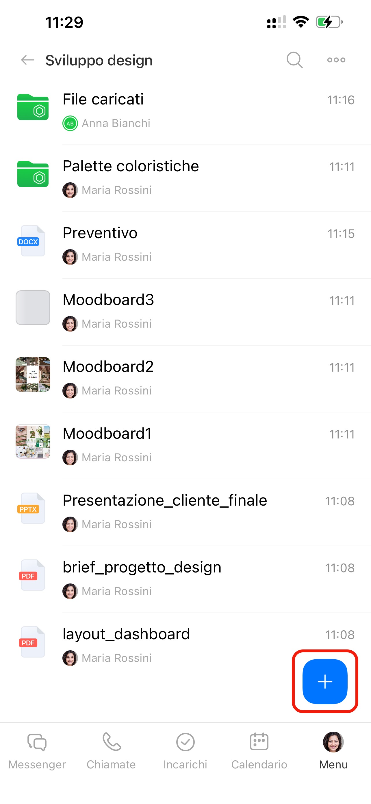 Nella collab. Vai nella sezione File della collab per visualizzare tutti i documenti aggiunti, inclusi gli allegati a incarichi, riunioni e chat. Ogni file mostra il proprietario e la data in cui è stato caricato o modificato.